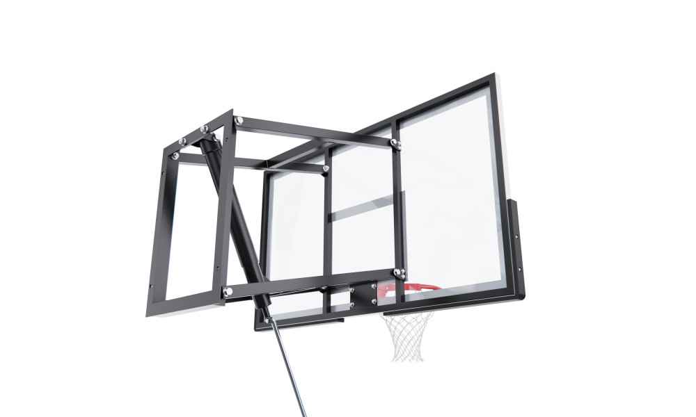 Щит изготовлен из прочного поликарбоната толщиной 3 мм — материала, обеспечивающего хороший отскок мяча и устойчивость к ударам. Его размеры — 136 х 80 см, что делает его максимально приближенным к профессиональному оборудованию. Регулируемый вынос щита (51–55,5 см) повышает безопасность и удобство во время игры. Дополнительную безопасность обеспечивает защита Poly Pade, установленная по нижнему краю щита.