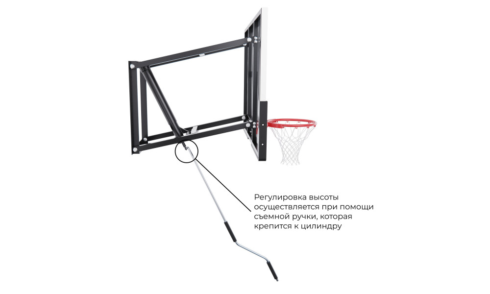 Кольцо стандартного диаметра 45 см устойчиво к интенсивной нагрузке. Высоту кольца можно регулировать от 227 до 305 см при помощи съёмной ручки, которая крепится к цилиндру, благодаря чему можно адаптировать баскетбольный щит под любой уровень подготовки и возраст игроков. Это особенно удобно при тренировках с детьми или в семейных играх. В целях безопасности запрещается висеть на кольце и других элементах баскетбольного щита.